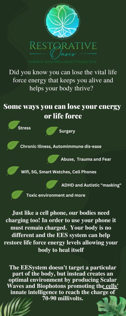 Energy Enhancement System is a 5th dimensional, scalar technology that emits an energy frequency that gives your body the energy it needs to repair itself. Just like a cell phone, your body needs charged, and can lose its “charge” or life force through things such as daily stress, surgery, trauma, wifi, 5G, smart watches, toxins, unprocessed emotional pain, physical pain and more. By sitting in the EES room, the biophotons will excite your cells and give them the energy they need to heal and restore itself. It’s natural, easy and a fantastic compliment to any wellness protocol.